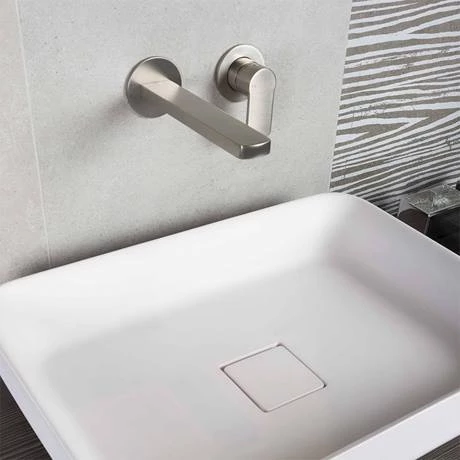 The Teatro Brushed Nickel Wall Mounted 2-Hole Basin Mixer adds sophistication and style to your bathroom. Made from brass with a trendy brushed nickel finish, the range is characterised by it’s stylish flat spout and sleek minimalist lever handles.