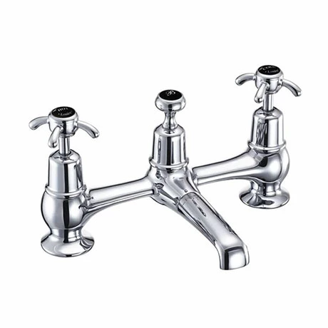 The Burlington Anglesey Black Bridge Basin Mixer is the perfect complement to Burlington’s Jet Black range. This basin mixer is constructed from brass and beautifully finished in chrome. It features traditional screw down valves and a swivel spout with a 360° swivel range. Comes supplied with a plug and chain waste.Â