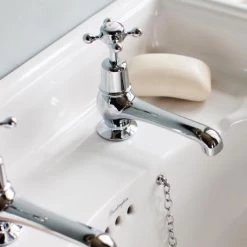 The Burlington Anglesey tap range with black ceramic indices is the perfect complement to Burlington’s Jet Black range. These basin taps are constructed from brass and beautifully finished in chrome. The Regent base gives the tap a ridged, slightly taller, elegant appearance. It features traditional screw down valves and come supplied as a pair.