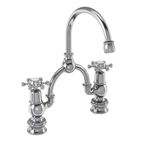 The Burlington Birkenhead Regent 2 Tap Hole Bridge Curved Spout Basin Mixer (230mm centers) with Invisible Overflow, create the perfect period bathroom with our range of quality chrome plated traditional taps. Comes with a 10 year guarantee. All Birkenhead taps have a six spindle tap head with a ceramic indice in the centre.