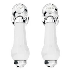 These Antique Brass Chatsworth 1928 Traditional Crosshead Pillar Basin Taps are just the thing to top off your vintage inspired bathroom. The 130mm high basin taps have a decorative shape with a period feel, while their antique brass effect bring a touch of sophistication to your bathroom. Finely crafted cross taps add to the look and feature white inlays with ‘hot’ and ‘cold’ in classic lettering. Made from hard wearing solid brass, these traditional basin taps will stand the test of time. Pair them with other designs from the Chatsworth Antique Brass collection to create a cohesive look.