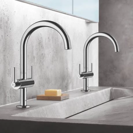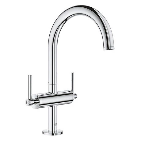 The Grohe Atrio basin mixer is a premium, high performance tap ideal for those wanting to make a style stamement. It features a twin lever handle design offering precise control and a high C-spout that swivels 150° for extra user comfort. Crafted from high quality materials and finished in GROHE StarLight chrome coating that is scratch resistant and easy to clean. Comes supplied with a click clack waste which simply opens and closes with an effortless push.